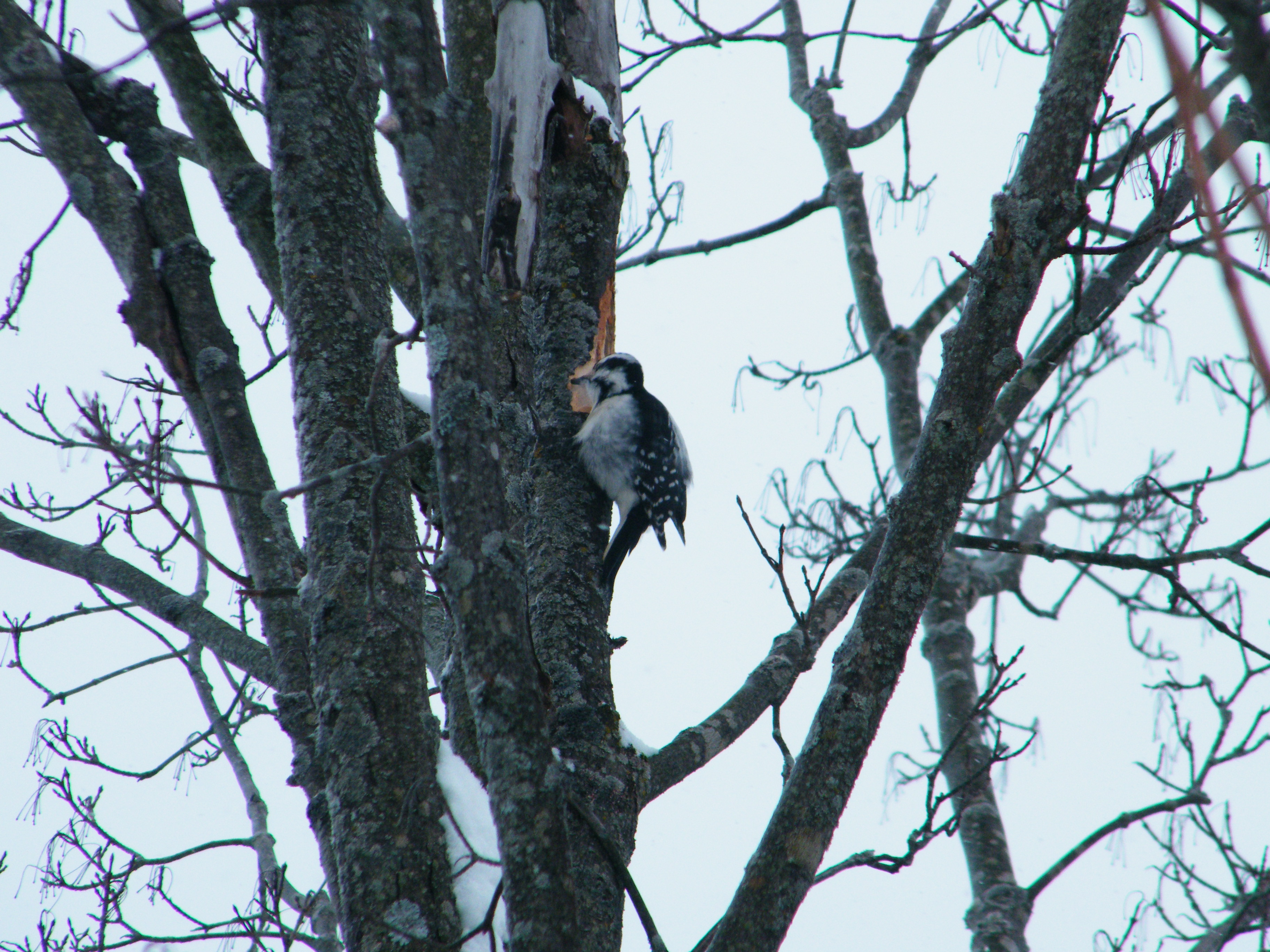 Always like to keep an eye out for wildlife. It was pretty quiet in our trounce through the snow. Then we hear this “tap, tap, tap, tap”. Do you hear it? Scanning the trees, we eventually locate the source. It is a Downy Woodpecker. The “Downy” is one of 9 woodpecker species native to my province of Ontario, and one of the 216 woodpecker species worldwide. I marvel how this downy woodpecker could smell “food”, in the form of overwintering insects within this dead tree branch, even though it was -13C. Hungry anyone? 🙂