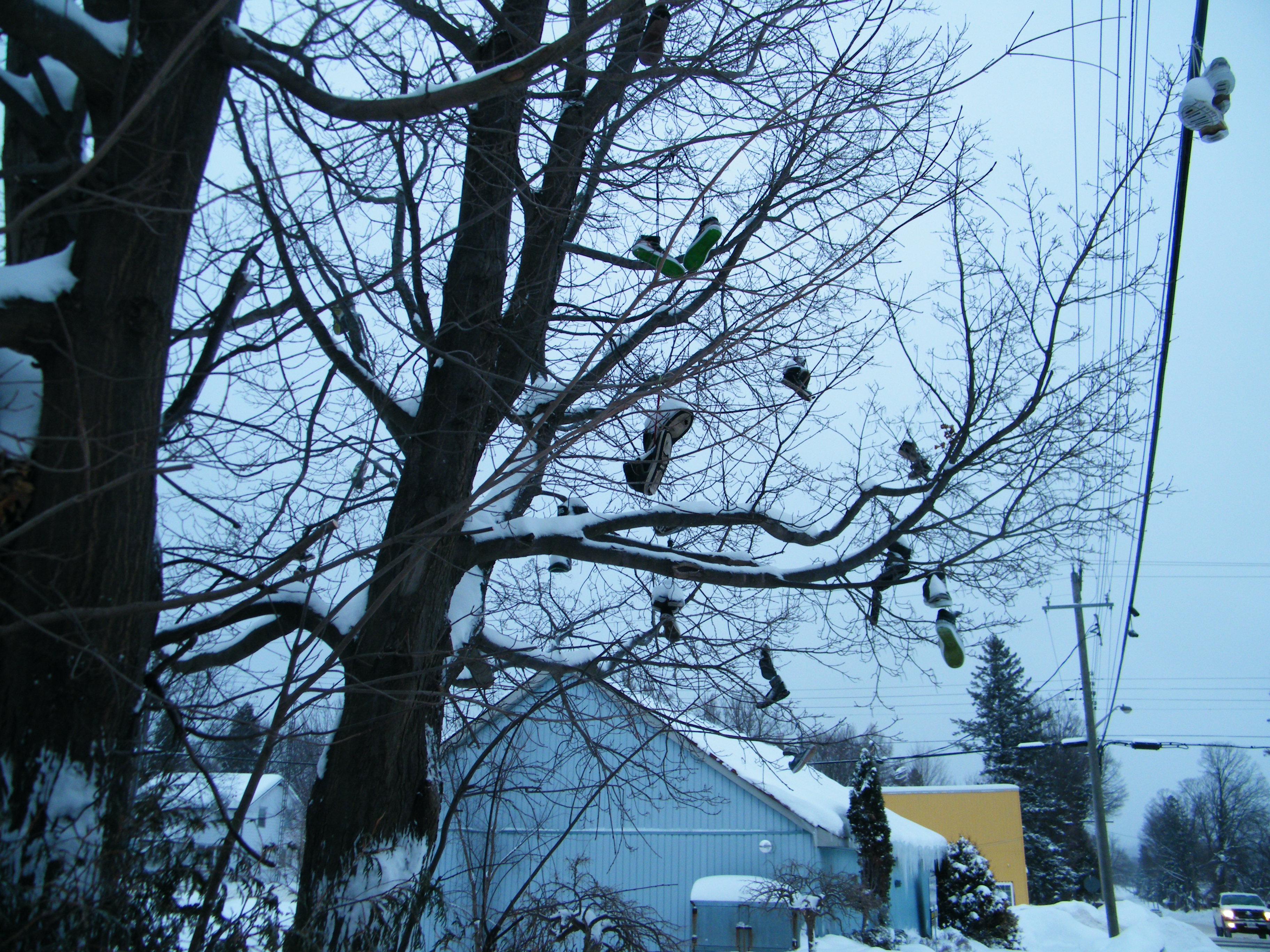 • Yeah, the shoes used to be thrown over hydro wires, and Hydro One would come by with their bucket trucks to remove them on a regular basis. Then all of a sudden it stopped. I am assuming the police might have gotten involved, sparking a bit of fear in the youth, because now the shoes are nearly always on tree limbs. However, I see on the picture one pair did end up on the wires. The amount of shoes that have made it onto the wires and branches over the years is staggering. I am beginning to think there MUST be people walking around barefoot. Where do they all come from? And I can picture the mother and father asking, “What did you do with your shoes?….LOL