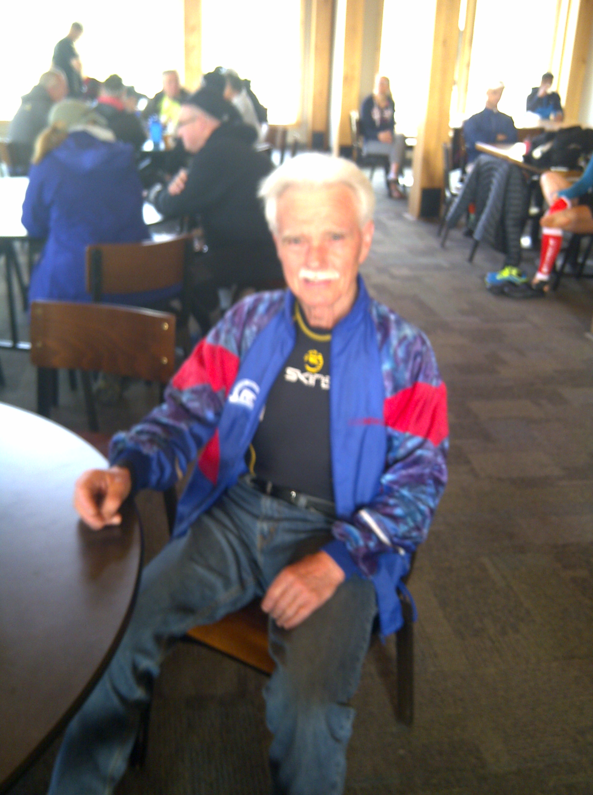 There was 71 year old running legend Jess Heroux. I met Jess for the 1st time at last years Creemore Vertical Challenge. And as we have continued to stay connected we have become friends. Jess had taken a 9 hour bus down from Kirkland Lake to Barrie where his niece lives. I had the privilege of picking him up there and taking him to the race. Before 1993 Jess has run Boston Marathon seven times. He has competed in the major 100 mile ultras, which are Old Dominion, Western States, Leadville, and Wasatch. But in 1993 at 47 years old Jess had an aneurism and on the operating table he had a stoke that almost took his life. He survived but was left paralyzed on the right side of his body.