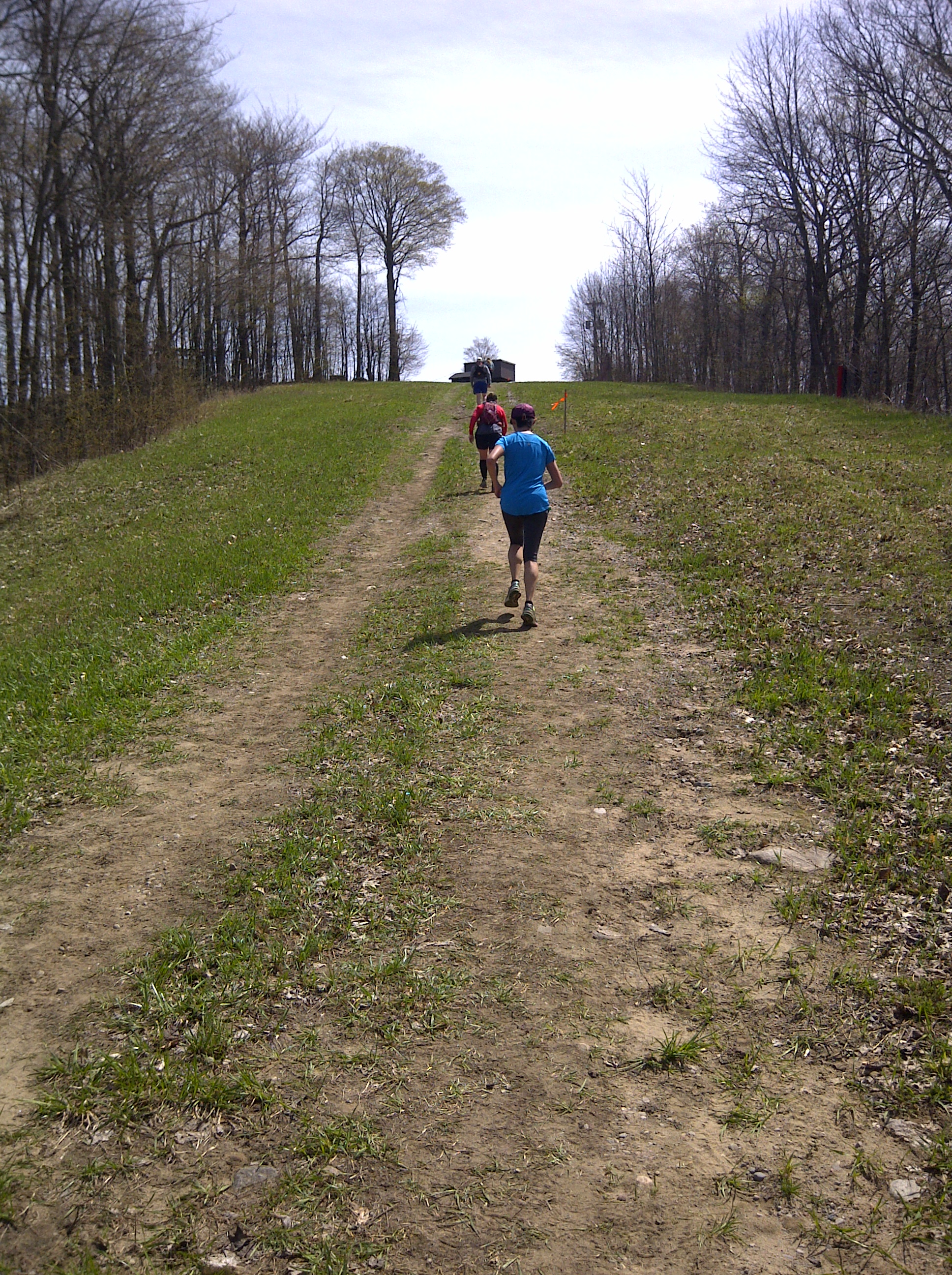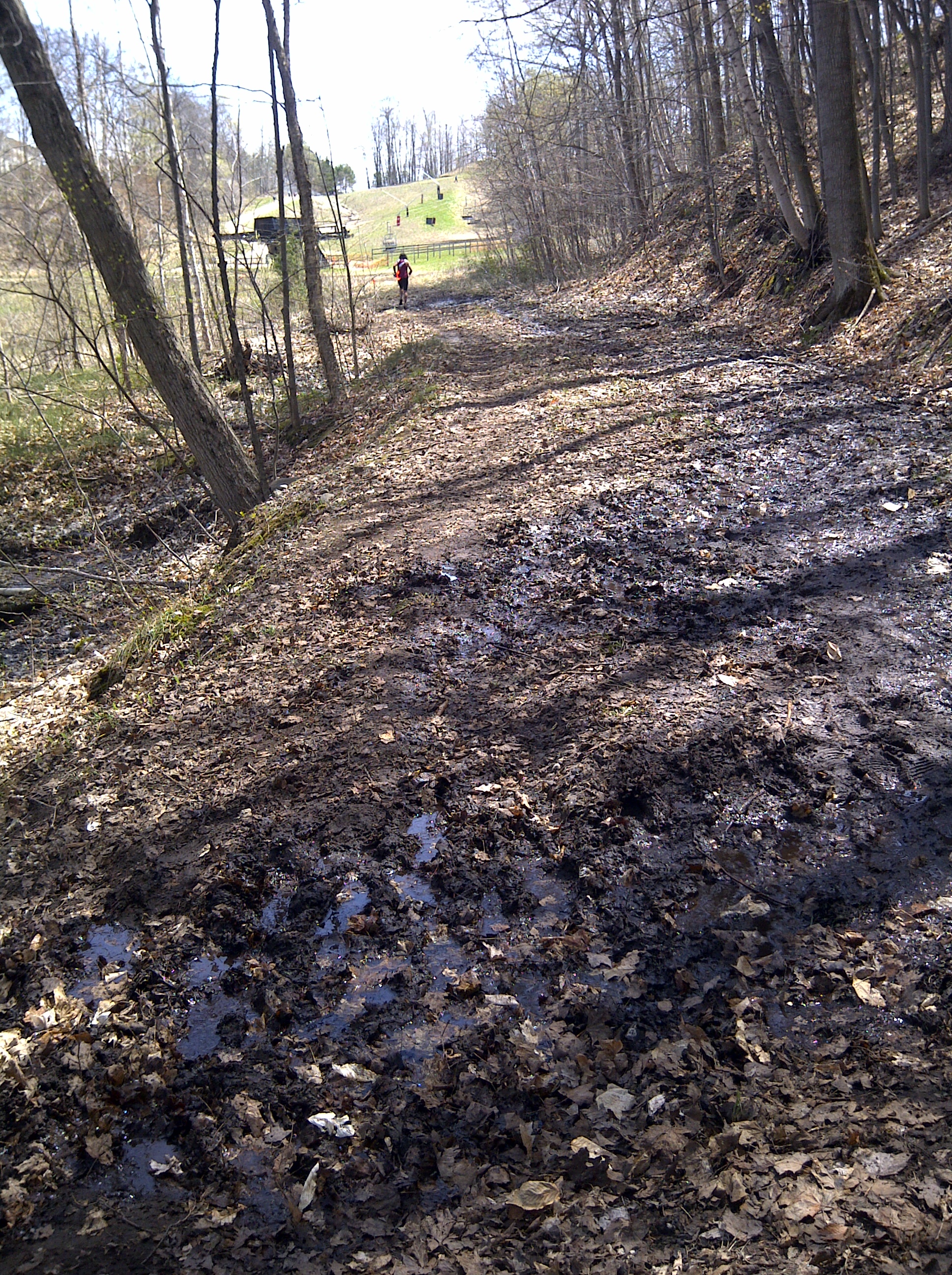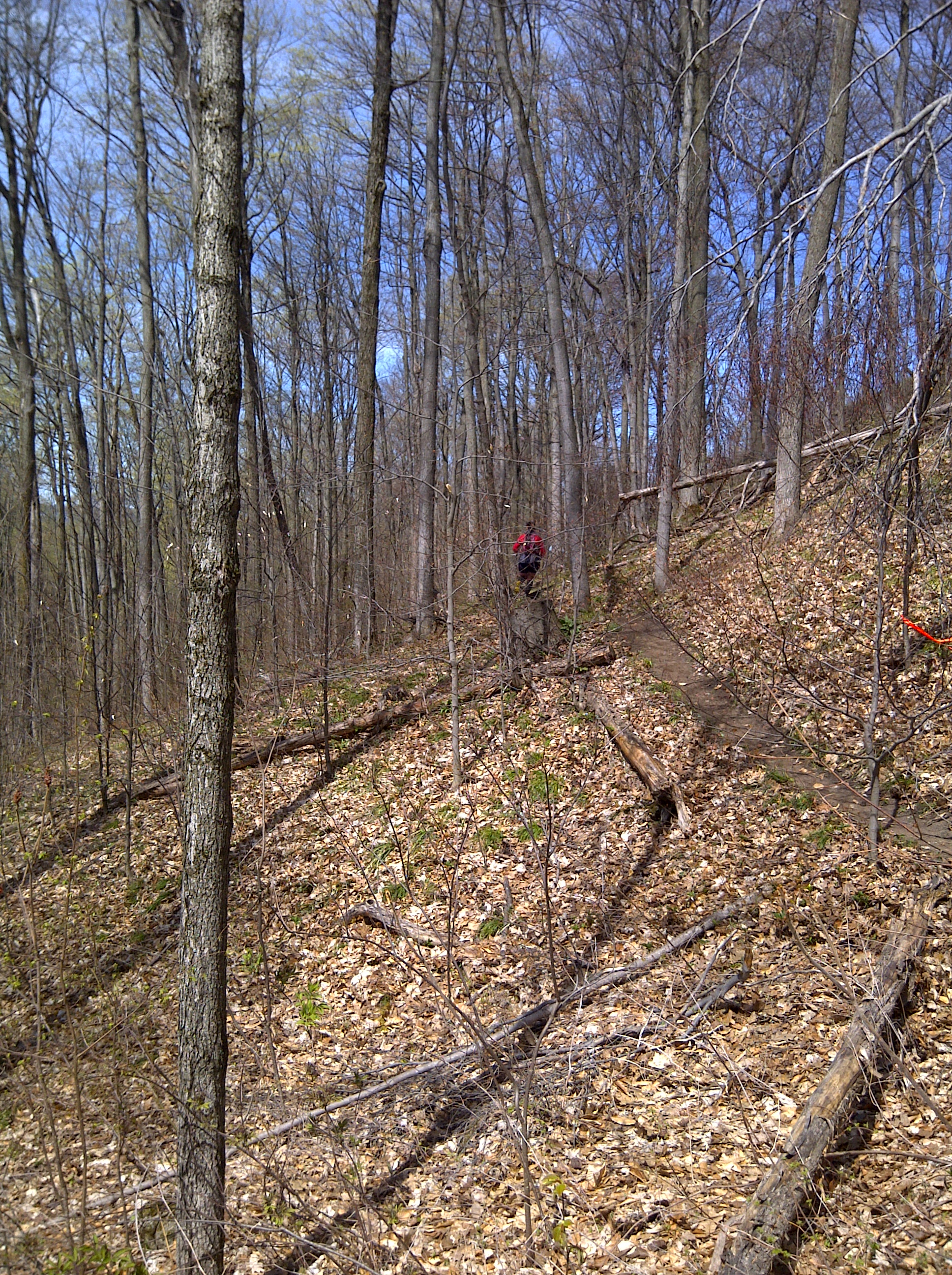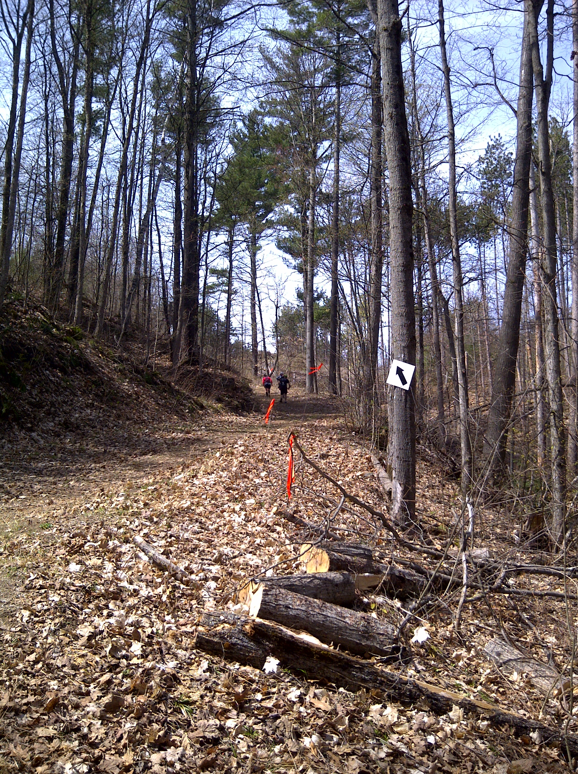 Race director Adam Hill and his crew did an amazing job of trail prep. The course was so well flagged with red ribbon and caution tapes to keep runners on course. And in the hardwood forest single track it appears to me that either raking or leaf blowers must have been used to clear the trail down to the bare earth. I can’t imagine how many hours this must have taken to clear several kilometers of hardwood single track. The leaf blowing uncovered any hidden holes, rocks and roots so they are more visible to the runner.