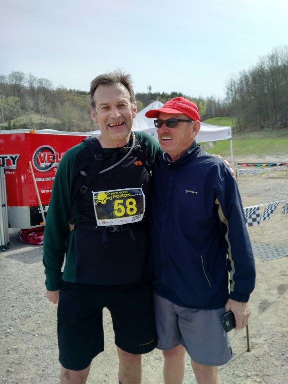 Pierre Marcoux (on left) with running legend Joe Cleary at 2016 Creemore Vertical Challenge. Joe started running at 45 and in the 30 years since he has run 537 marathons and ultras.