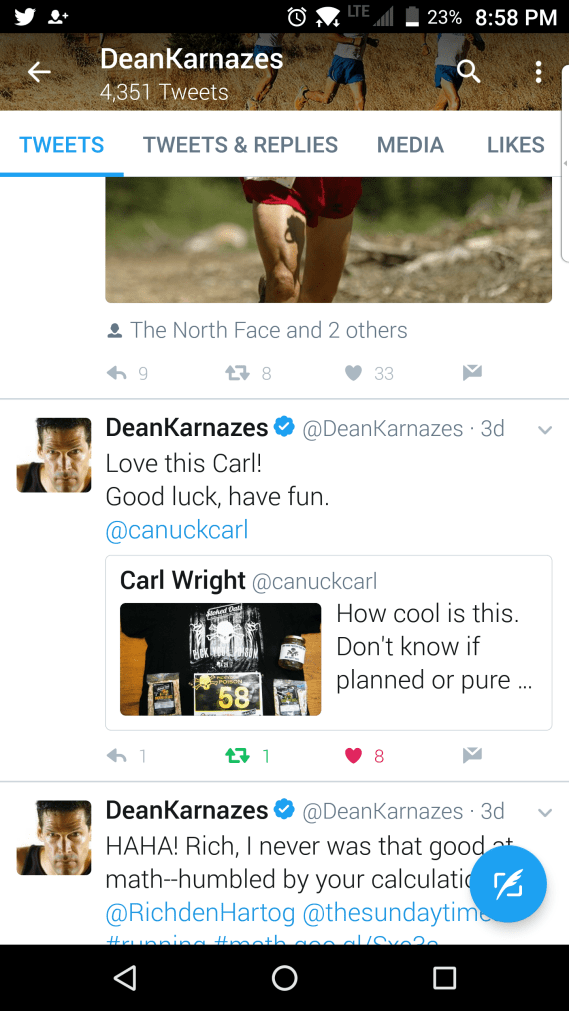 I love the ultra running community so much. As a “mere 50k runner” I never feel looked down on by the elite 100 mile runners. And when I think of elite runners who really care for the average runner I think of Mr. Ultramarathon Man himself Dean Karnazes. Coming home from bib pickup I was so amazed with that #58 (which was my age). And what became of that picture I took and posted it on Facebook and on Twitter? Later that evening I discovered there was a retweet on Twitter with a few words of encouragement from Dean. It said, “Love this Carl. Good luck, have fun”. And I did have so much fun. I met Dean for the first time at the North Face Endurance Challenge last year in the Blue Mountains, and was so amazed when he wanted to hear about my running journey. Dean Karnazes is one of the world’s greatest ultra-marathon runners, yet he continues to take an interest in, and encourage the average runner such as myself. This is so incredibly inspiring, and leaves such a huge impact on me.