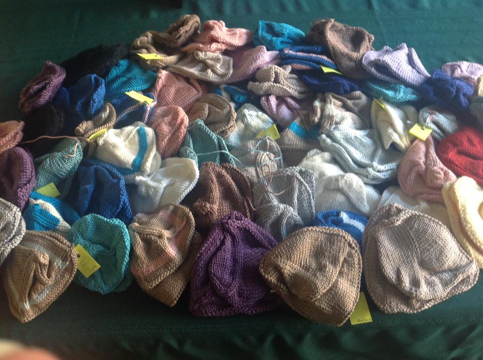 Lots of love knit into this table of knitted knockers all ready to be stuffed by my wife and her knitting friends.