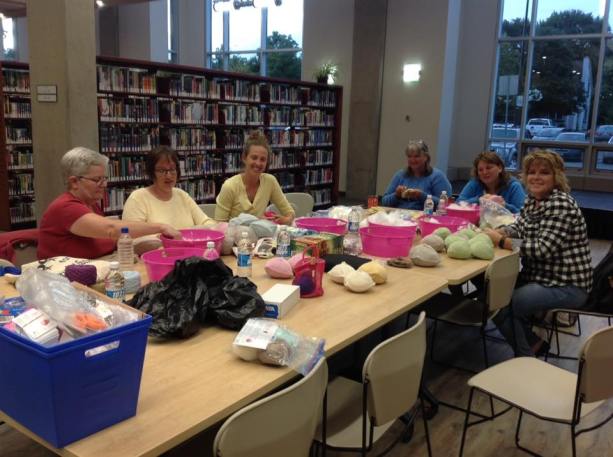 My dear wife with some her knitting friends at the local branch of Knitted Knockers held the 1st Thursday each month at Barrie Library. Image Source Knitted Knockers of Canada Facebook page.