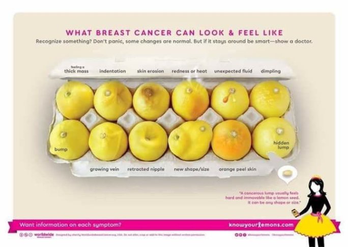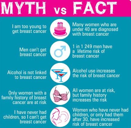Another thing to add to the chart, “Myth versus Fact.” When I was diagnosed with breast cancer, I remember telling the doctor, “But it didn’t hurt!” Pain is not necessarily a symptom of breast cancer as I thought it was.