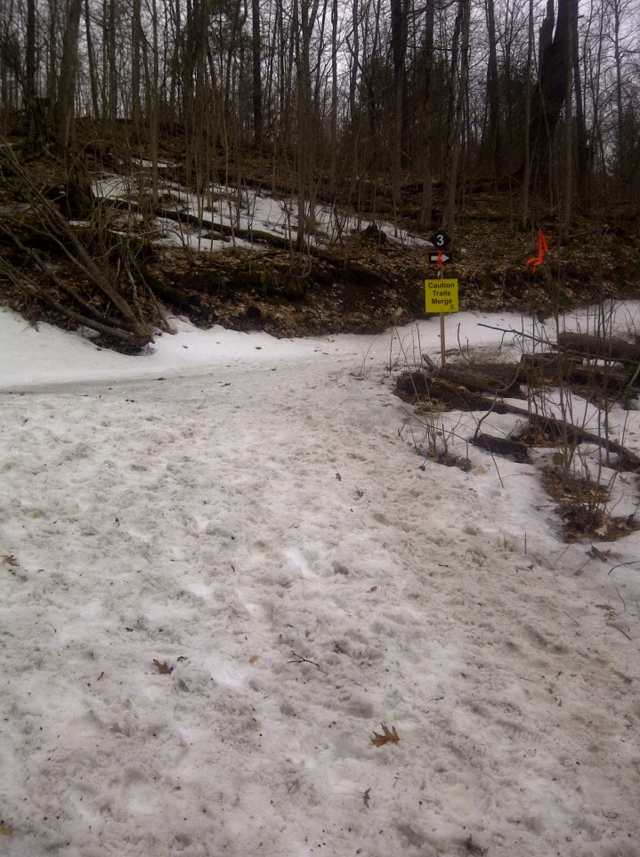 I made the decision that I was not going to spend any time taking photos on the course of this year’s Pick Your Poison Trail Run. It was 7 days, or the Saturday prior to my 50k and I went to the very forest reserve to get in my last trail run in before the race. My plan was park at a parking lot on the back side of the forest closer to my home, and I would run some other trails until I connected with the trails in Copeland Forest the race would be held at. I have done this a handful of times before. However this time the snow was so heavy and deep from a spring snowstorm that dumped 21 inches the previous weekend I could not even manage to make it as far as the race course trails. Covering a mere 8 kilometers in 2 hours in the deep, heavy wet snow, I returned to my car feeling exhausted and very defeated. How on earth am I ever going to complete a 50 kilometer race the next weekend in under 8 hours?