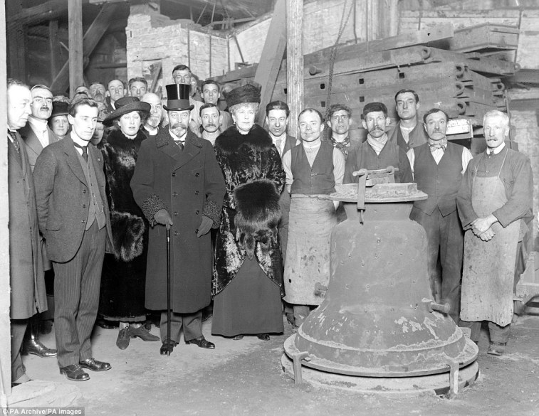 King George V and Queen Mary in photo dated 1919 (a year after World War 1 ended) at Britain’s Whitechapel Bell Foundry. Guinness Book of Records listed it as Britain’s oldest running manufacturing company. Established in 1570, it closed in May 2017 putting that record to an sad end. This is the foundry that manufactured London’s “Big Ben” bell. Big Ben remained silent for the entire Great War, and was tolled again in jubilation once news broke out that the Great War (World War 1) was over. Image Source