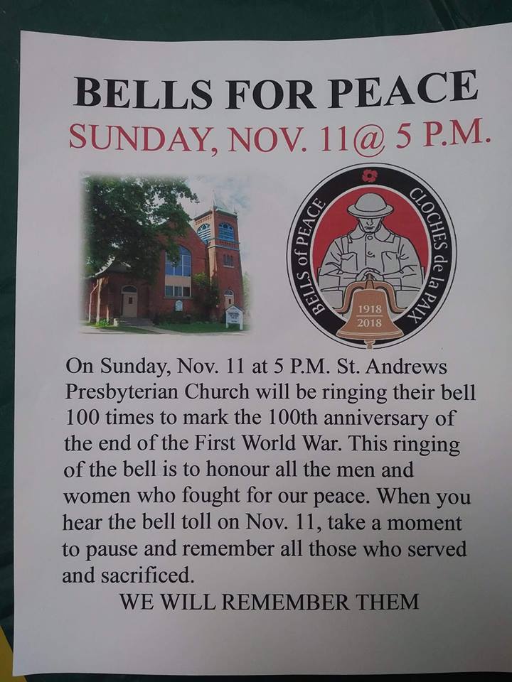 Flyer for the Bells for Peace at the Hillsdale church, an initiative that will see many hundreds of legions, churches, municipal buildings and naval ships ringing their bells across the country. When you hear the bell toll, please remember to take a moment to pause and remember all those who served and sacrificed.