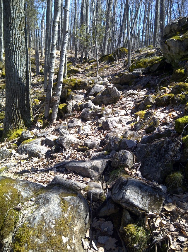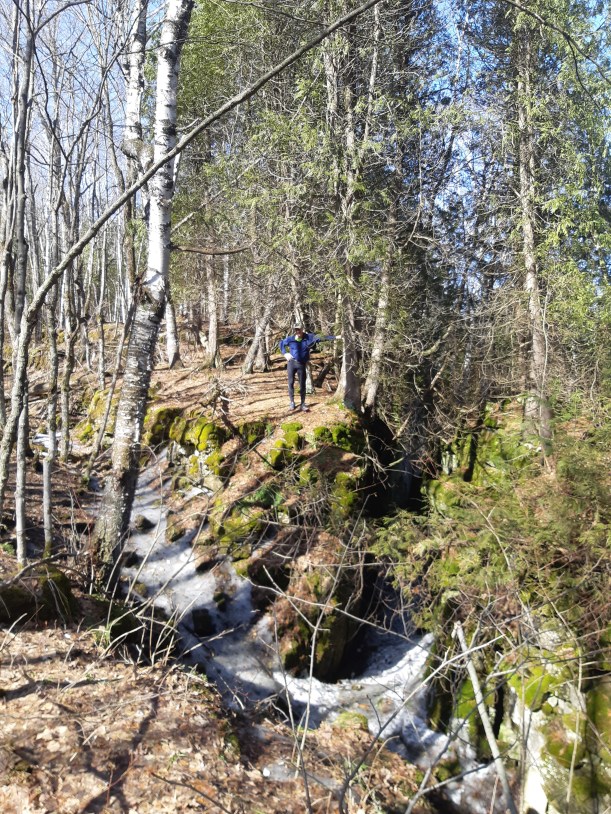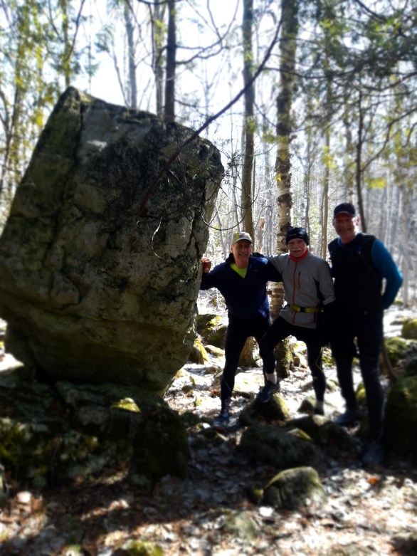 Kept the same pace as I ran with Pierre on my 1st loop. The three kilometer climb up the escarpment, the “not winter maintained” road, the paved county road and then back in the Noisy River Provincial Park. It was just as beautiful as I remembered it the first loop. Made it through the icy patches in one piece. And I was just going through the technical boulder patch when I heard a noise that had me frozen in one place. My heart was pounding. My hair was standing on end. This was near the caves and caverns, ideal places for bears to hibernate. And bears are coming out of hibernation right this time of year. And they are very hungry.