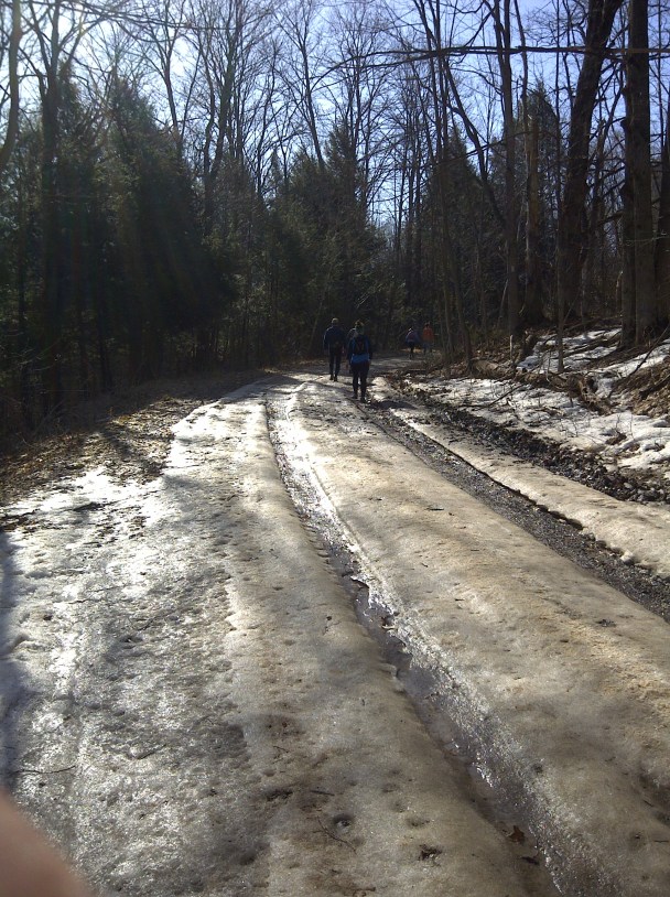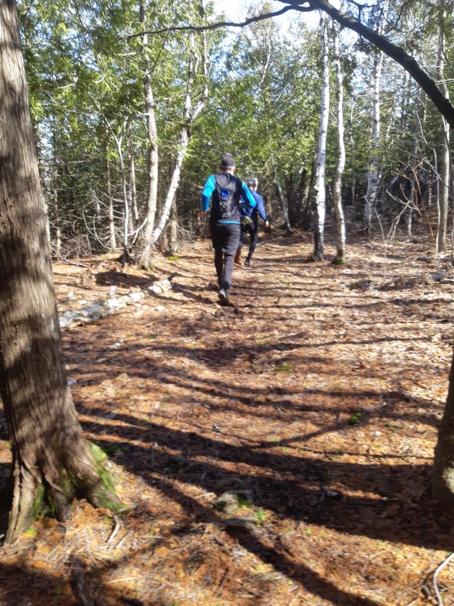 Pierre and I continued our run through Noisy River Provincial Park. It was so incredibly beautiful, but also challenging particularly this time of year. We were following the white blaze markings of the Bruce Trail. There was a lot of leaf litter from last fall and in places the trail was difficult to follow. There was some steep climbs, mud in places and technical boulder patches. There was also some very treacherous icy patches where the only way to stay upright was to grab onto the trees.