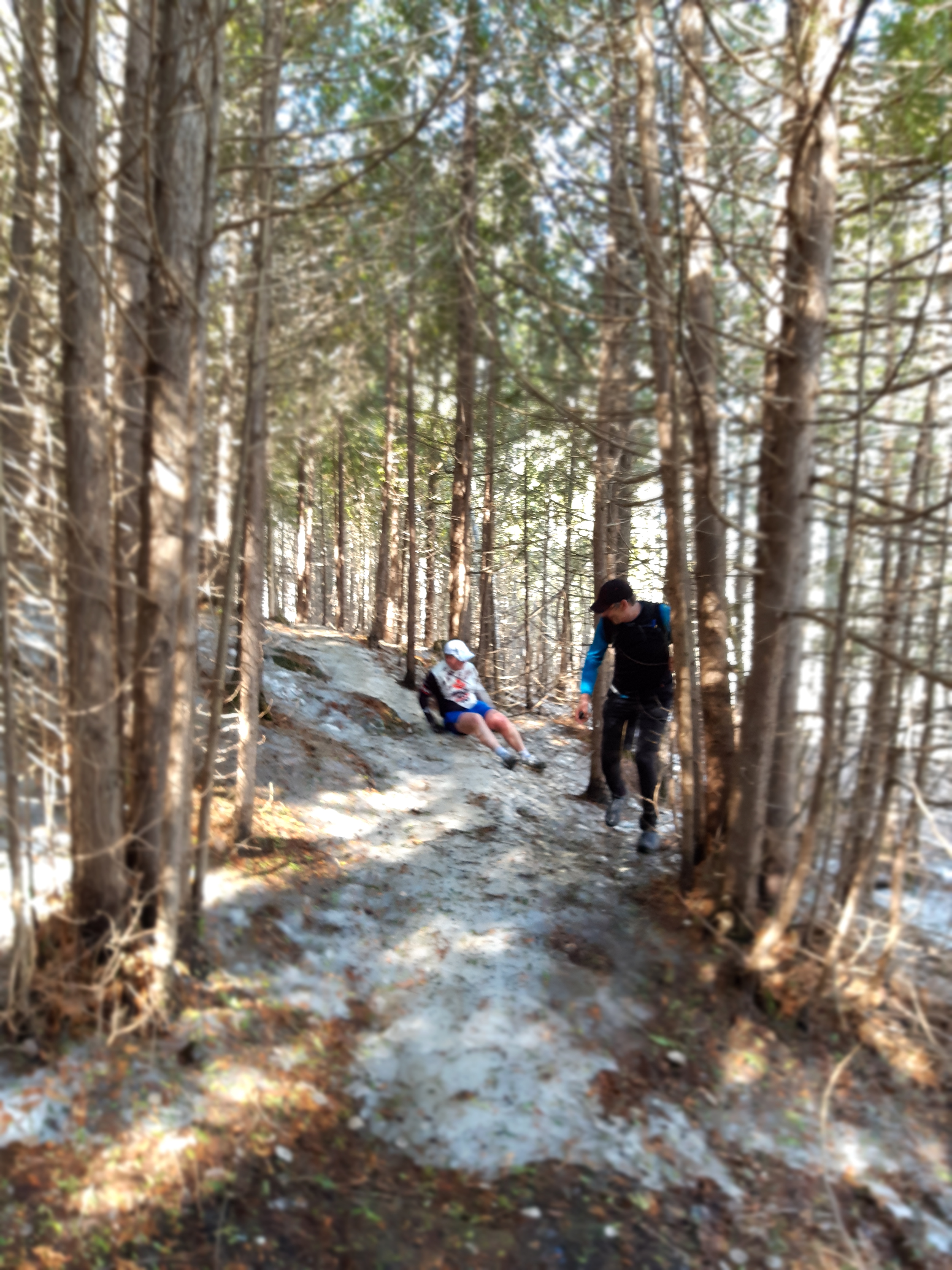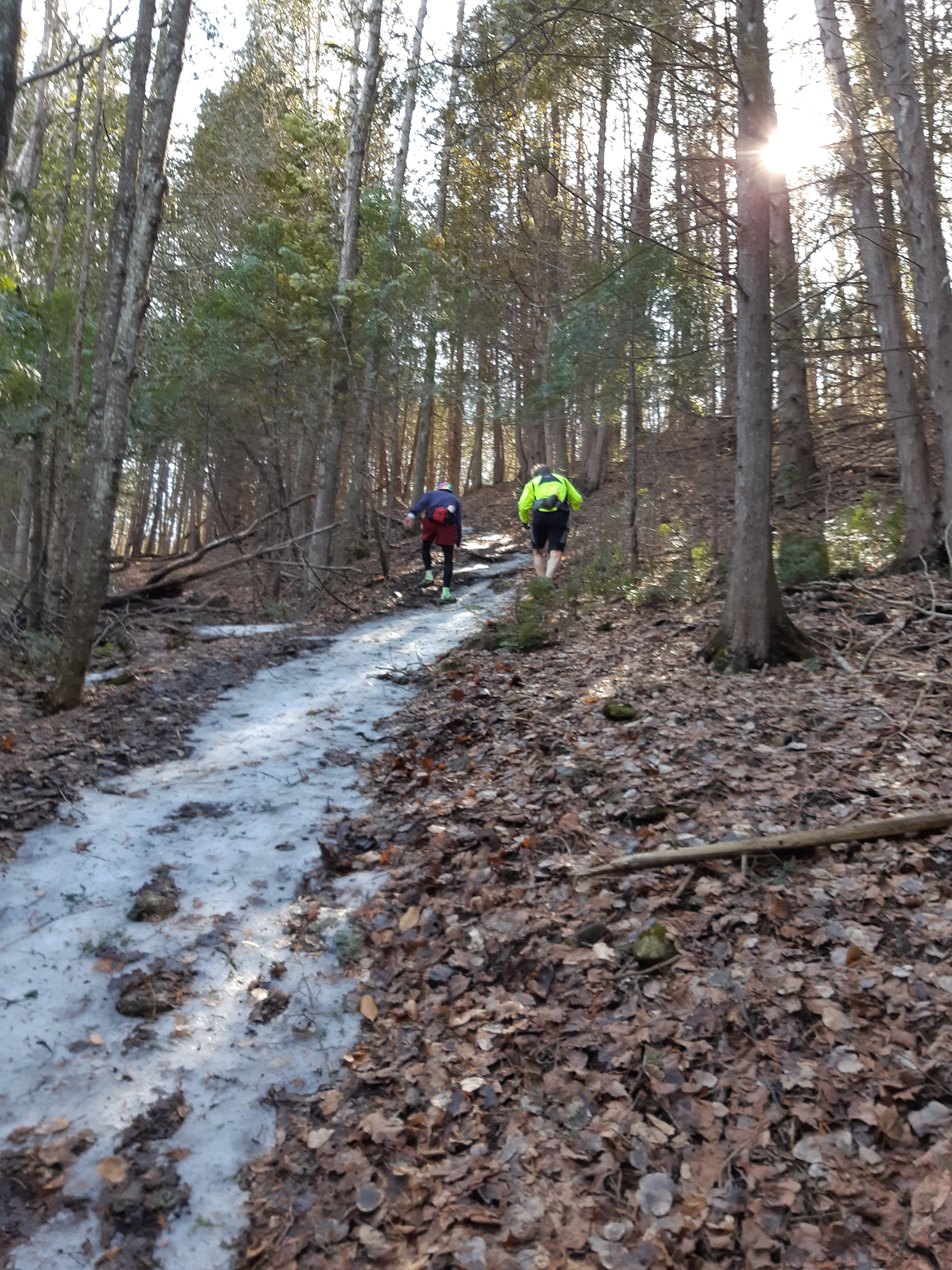 Pierre and I continued our run through Noisy River Provincial Park. It was so incredibly beautiful, but also challenging particularly this time of year. We were following the white blaze markings of the Bruce Trail. There was a lot of leaf litter from last fall and in places the trail was difficult to follow. There was some steep climbs, mud in places and technical boulder patches. There was also some very treacherous icy patches where the only way to stay upright was to grab onto the trees.