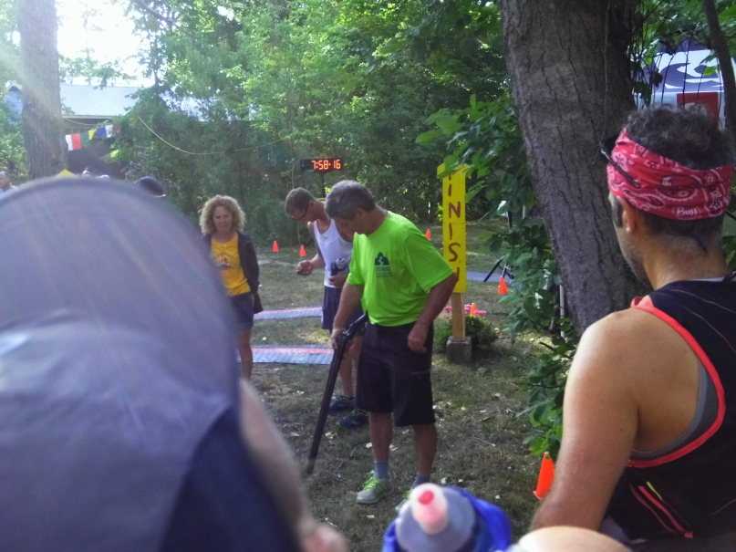 Held right on Pierre and his wife Lee Anne’s property the Creemore Vertical Challenge had a real “family feel” to it. Pierre is getting ready for the “literal” shotgun start. Lee Anne is in the yellow shirt. A legend herself, Lee Anne holds the Canadian 100-mile record for women 60-64