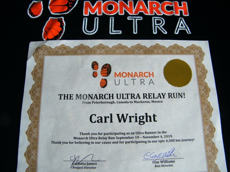 I will take this certificate over a medal any day. It reads “Thank you for participating as an Ultra Runner in the Monarch Ultra Relay Run September 19-Novomber 4, 2019. Thank you for believing in our cause and for participating in our epic 4,300 km journey”