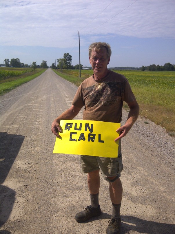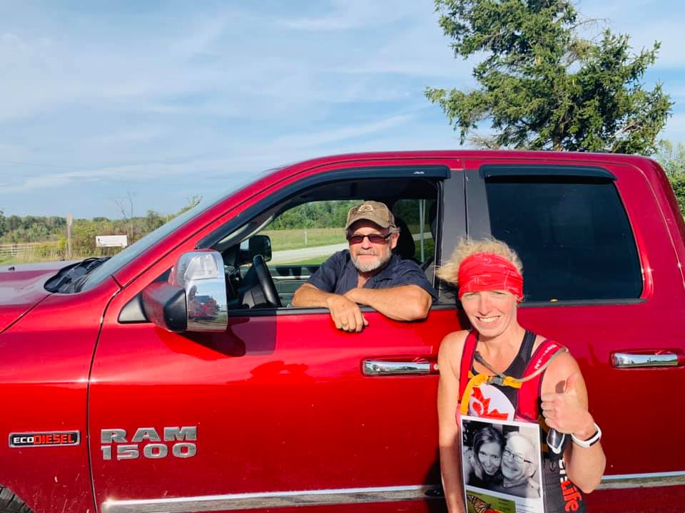 I was not sure at what portion of Julie’s portion of her 100k that I should join. But deep down I wanted to run at least 50k if I could. After all, it is called the Monarch ULTRA. And besides, I sort of let the “cat out of the bag”, when I said in a CTV news interview I wanted to run up to 60k. So at the 50k mark, while the Monarch Ultra RV was waiting for Julie to arrive I laced up. Not long after a pickup truck pulls up on this deserted section of country road, and a friend named Elton gets out (who I have seen only once in the last 11 years). He used to work with me for years, but then moved to this area which was 4 hours away after our factory we worked at closed. He had a vague idea of my route, and kept driving back roads until he found me. What an incredible encouragement this was for me.