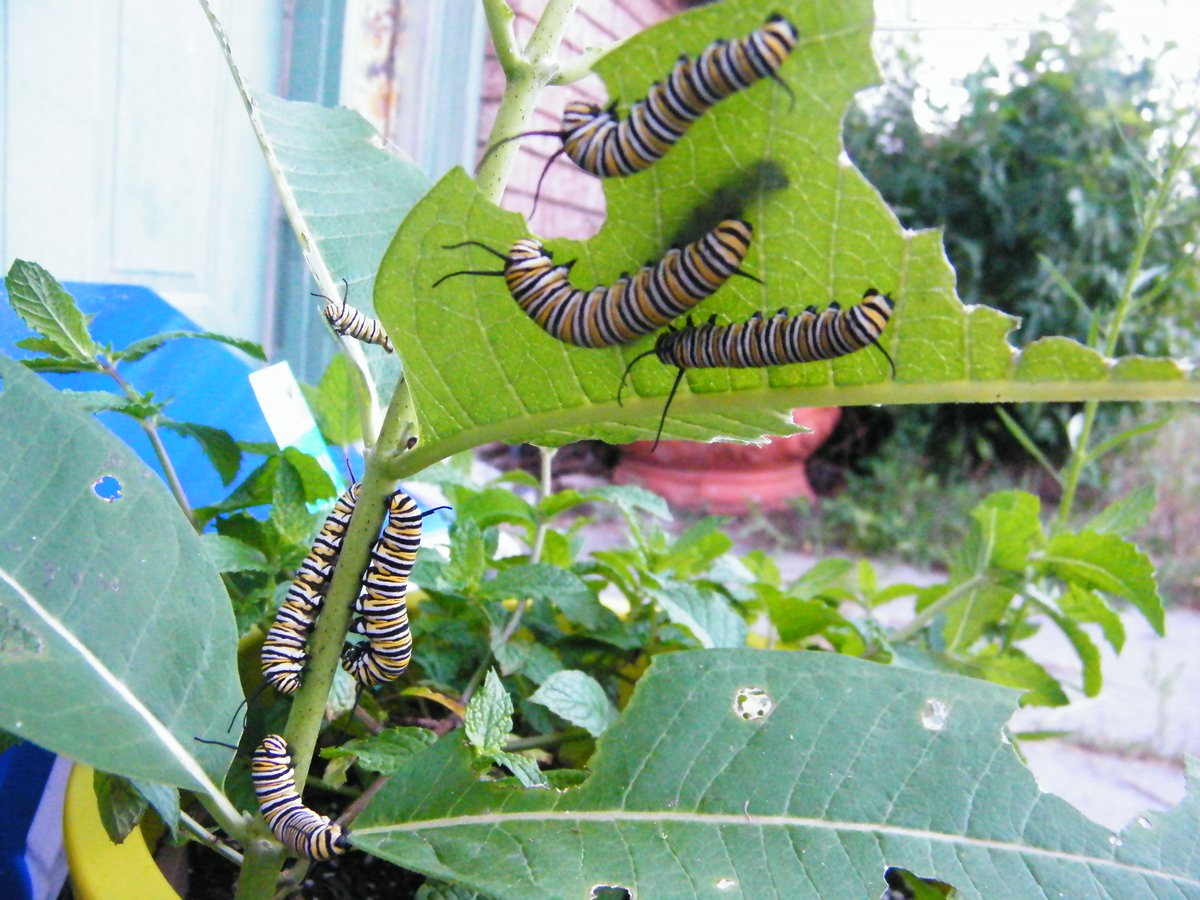 These Monarch caterpillars are on my own milkweed in my home garden. I have kept the patch small and tidy for 28 years hoping I would not be forced to eradicate it. Finally on April 11, 2014, the milkweed was removed from the noxious weed list in Ontario. You can now legally plant milkweed, the only food source for the Monarch caterpillar.