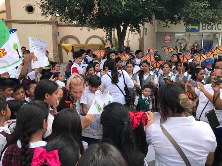 So very beautiful. Carlotta James stopping during her run to converse with the students out to greet her in Reynosa. Many were waving Monarch butterfly crafts and had made special Monarch butterfly posters and artwork. Image source Matushka Elizabeth Perdomo (shared from Monarch Ultra Facebook)