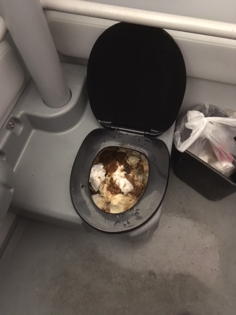 It was one of those “you got to be kidding” moments. With an approximate 3 hours before my revised connection in Dallas, I was hoping to change clothes and wash up (temperatures were now very hot in Dallas). The main washrooms were closed due to renovations, and this men’s’ port-a-loo was all there was. And no form of water at all. The ladies had a 30 foot trailer, and I was told it was very pleasant. In the Dallas heat I was gagging once I closed the door, so ended up waiting for the arrival of my next bus to use the bus toilet.