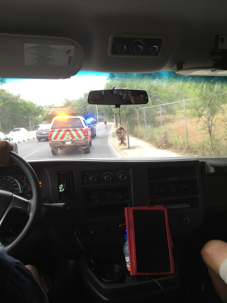Our run director Clay Williams making last minute planning. Carlotta has her hydration pack on, and is all ready to run at our meet up at the American School Foundation of Monterrey. From Google Maps I learned it is 20k from Chipinique. Her police escort would actually begin in between the school and Chipinque.