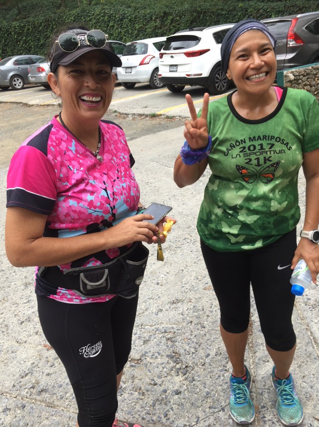 Our new friends Luis and Claudia had been following the police escort and were there at the park as well. It was such a beautiful location. Even though a mere 20 kilometers from Huausteca Canyon to the Chipinque Ecological Reserve entrance, it felt like I was in another world. Everything was so green, lush and tropical. As we were mingling about, a couple of ladies from Monterrey Runner Girls club had arrived to join Carlotta on the trails. The club had been connecting with Carlotta and it was beautiful to see these ladies meet in person for the very first time.