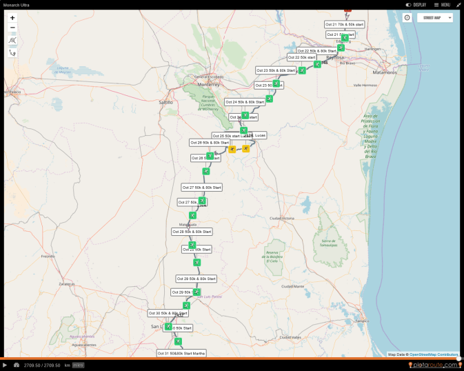 After 13 years on a computer I just learned how to do a “Screenshot”. This is an enlargement of run director Clay Williams Plotaroute map from Edinburg, Texas to south of the city of San Luis Potosi, Mexico. Screensaver shot was taken Feb. 13, 2020. Anything green did not have a registered runner for the Monarch Ultra. The only runner during those 11 days was Lucas Werger (the 2 yellow flags in the middle of the picture), on October 25th.