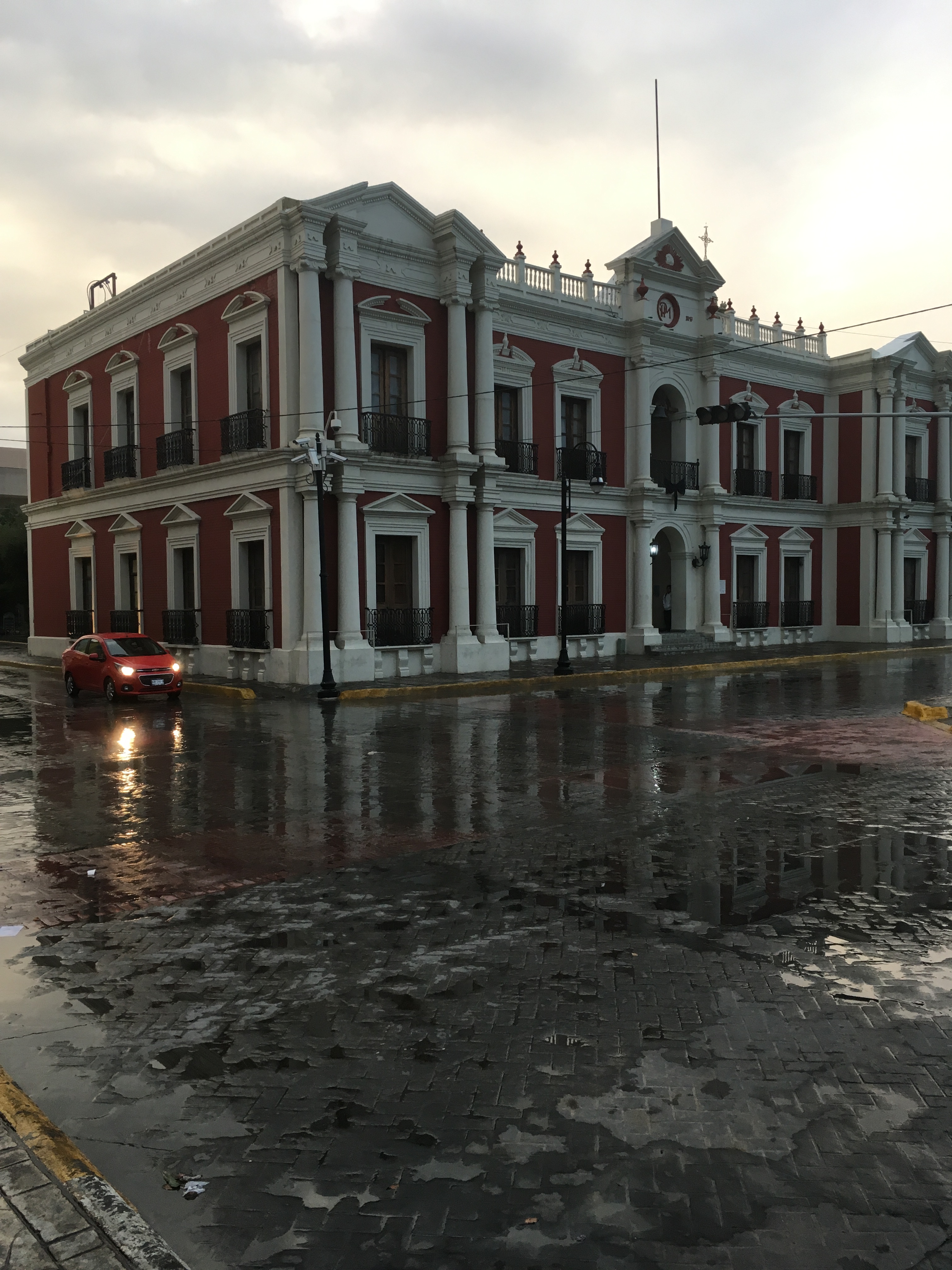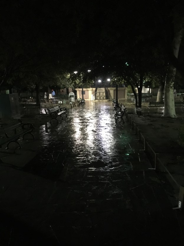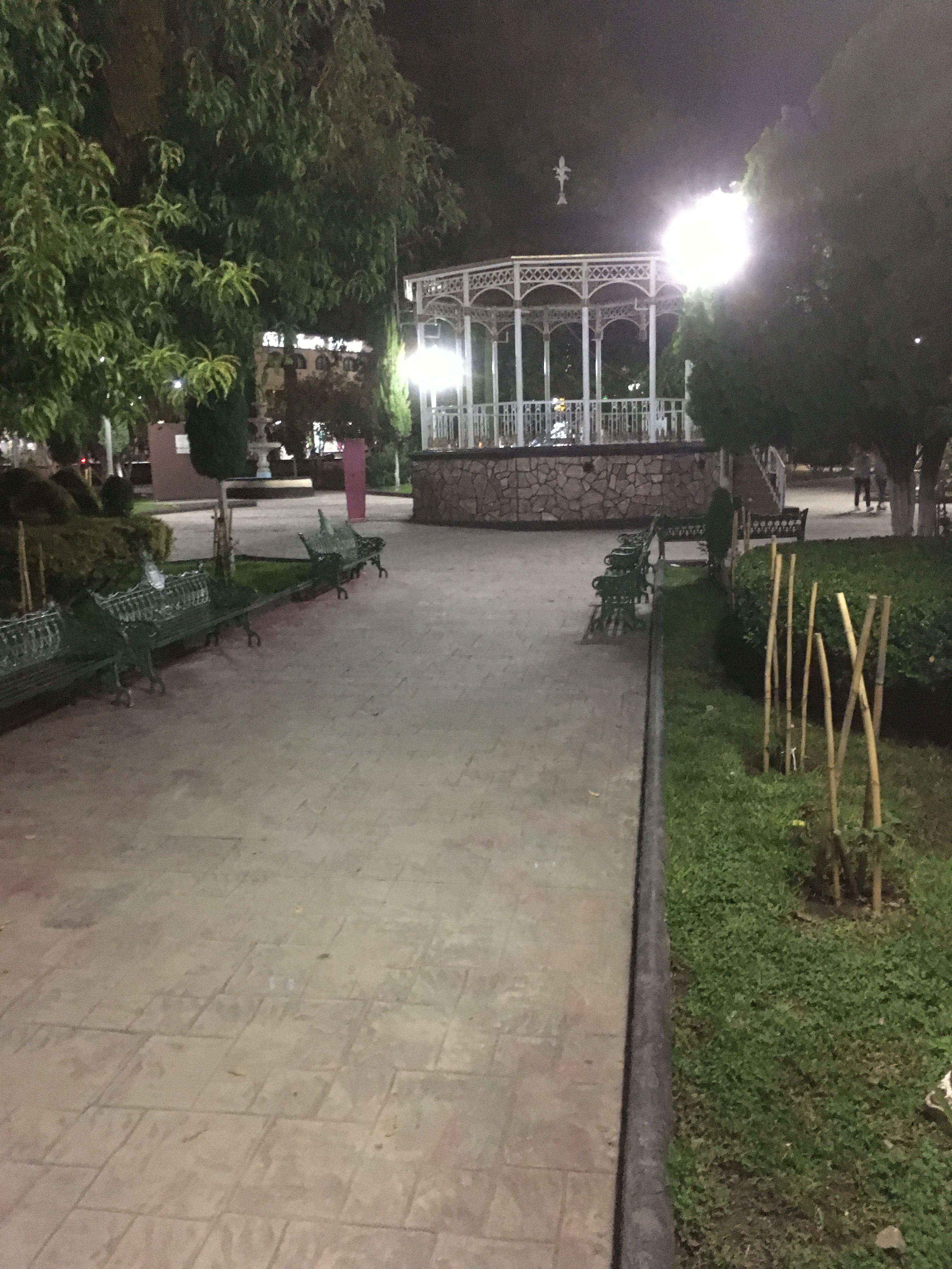 Took this photo when I first arrived at the Linares, Mexico town square. The plaza was right in the middle of the city, and it was huge. It was raining quite heavy so it was very quiet that morning. There are 4 pedestrian paths just like this one that lead to the centre gazebo or bandshell. Usually it is said to be very active here. People would come here to meet, mingle and connect.