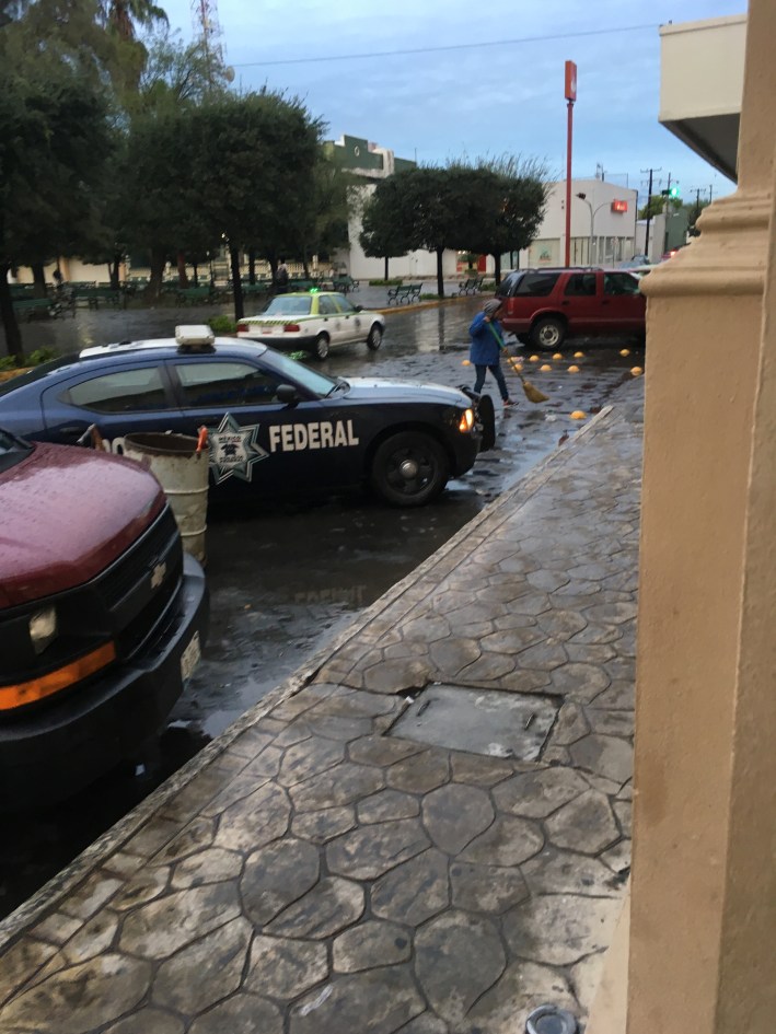 Dear hard working lady making sure the streets were meticulously swept spotless outside the city plaza in downtown Linares. You will notice the ladies cart between our van and the Federal Police car. The Federal Police would be escorting us this day.