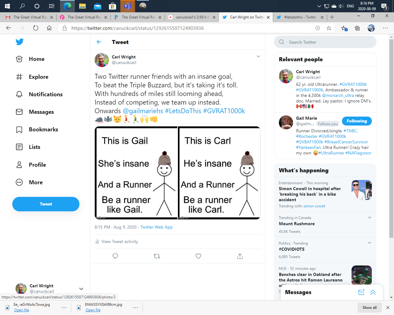 You are the best Catrina. I was wondering if you knew with the yellow t-shirt on Twitter. Did this very subtlety at the end of a thread that had random tweets of the highway sign and face coverings as I know Gail is pushing so hard out there to finish. Those who made it to the end of the thread might guess. You are always so sweet to read the entire thread…lol. I did not want to announce anything on Twitter until I knew she is done. By the sounds of it she had a massive distance day today, and it will be a smaller distance day tomorrow to wrap it up.