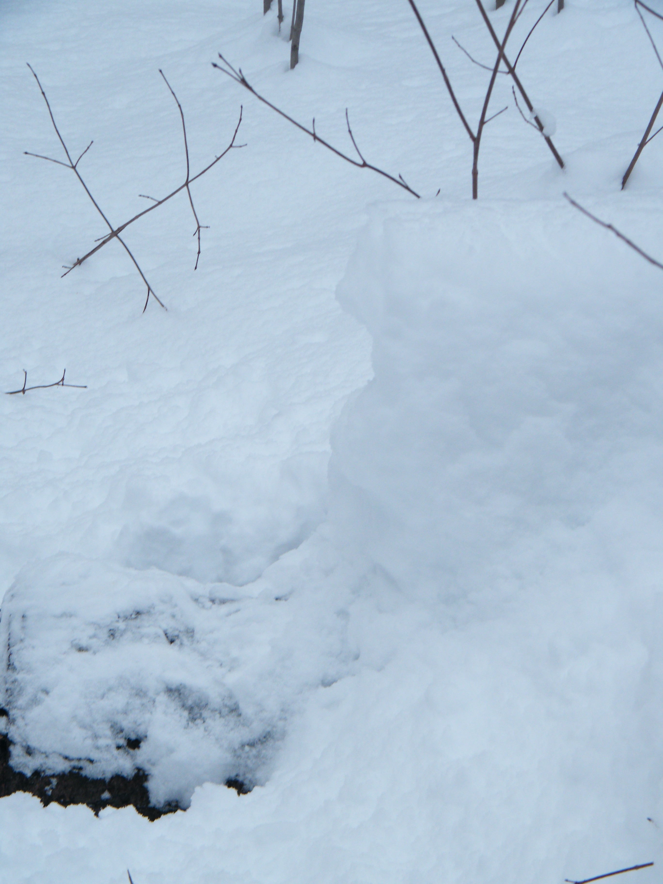 First of all, without a tripod I needed to brush away some of that beautiful snow away, and rest my camera on a fallen log for the pictures.