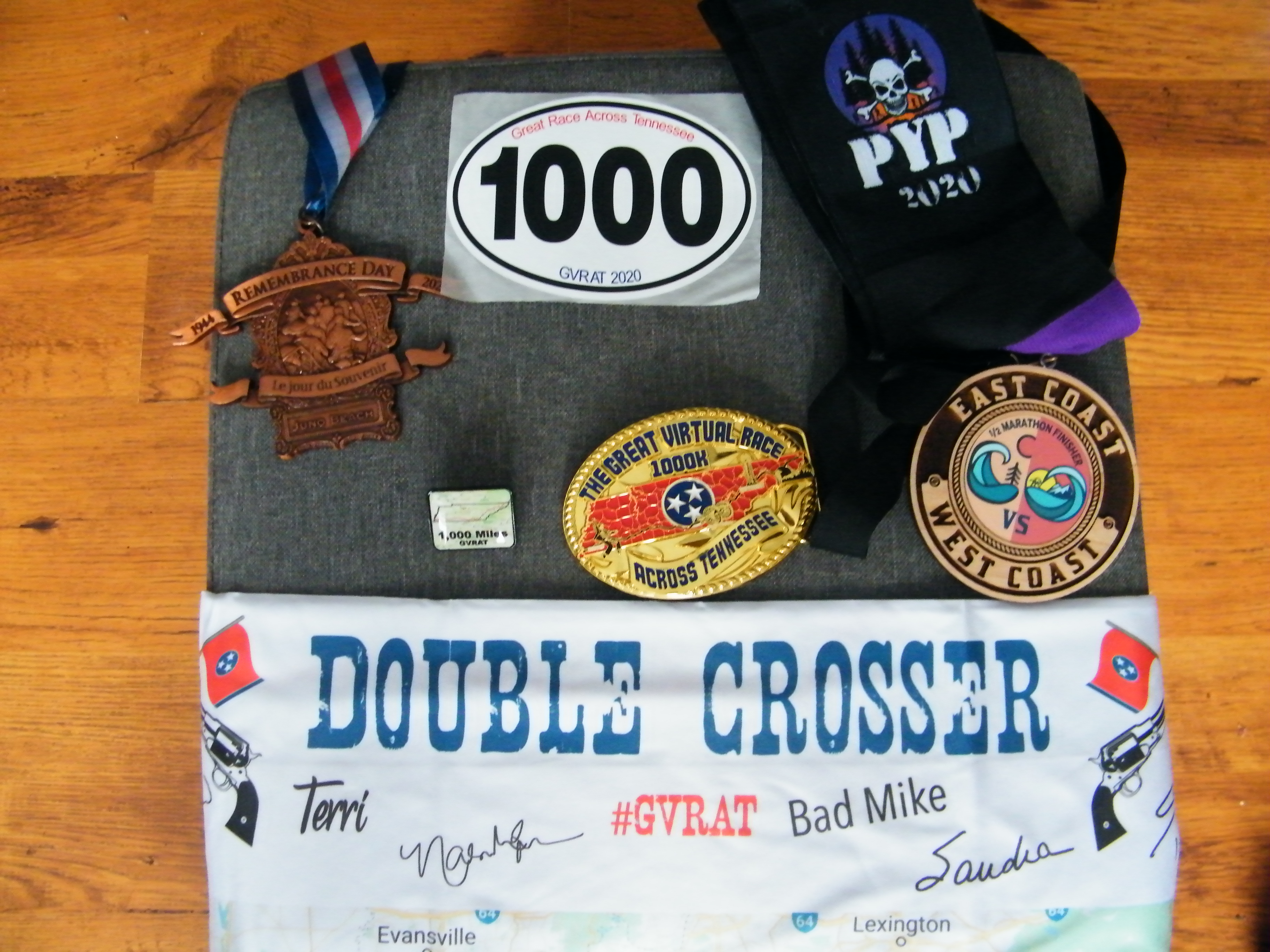 Some other 2020 virtual run swag. Pick Your Poison socks, East Coast/West Coast medal from Destination Trail director Candice Burt, a Remembrance Day virtual medal from VR Pro and a 1000 kilometer buckle, 1000 mile pin , Double Crosser linen from Great Virtual Run Across Tennessee.