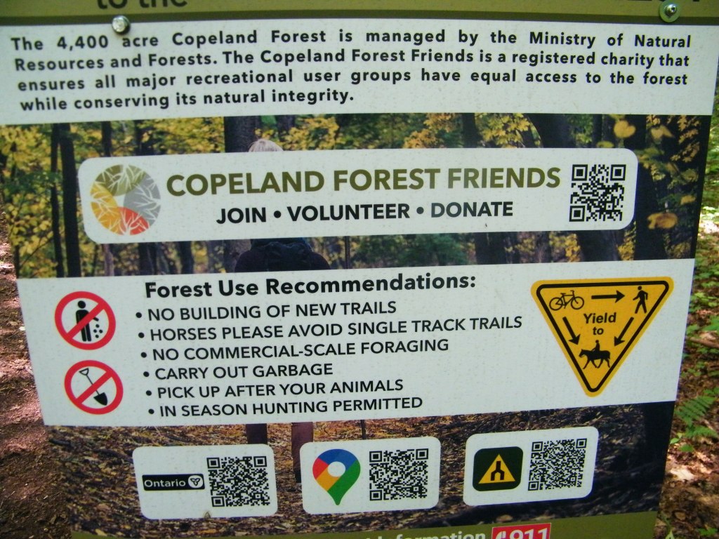 Signage is pretty straight forward both in Copeland Forest and the Simcoe County Forests of what is allowed and what is not allowed. There are a lot of those colorful smaller signs from Copeland Forest Friends Association (which I am a member of) in strategic locations along the border entrances of Copeland Forest. The “no commercial-scale foraging” is very well worded. It means it would certainly be okay to grab a few blackberries off a bush as a quick snack during a run. Or pick 2 or 3 mushrooms to throw in your lasagna for supper. But to haul out hundreds of pounds of mushrooms to sell for profit is wrong. In a sense, it is a form of poaching. Just without the blood. Sadly the “free for all” exploitation of our natural areas of any flora and fauna, and any natural resources above ground and below ground that has any value in exchange for the almighty dollar has brought much of our planet to the brink of an environmental abyss.