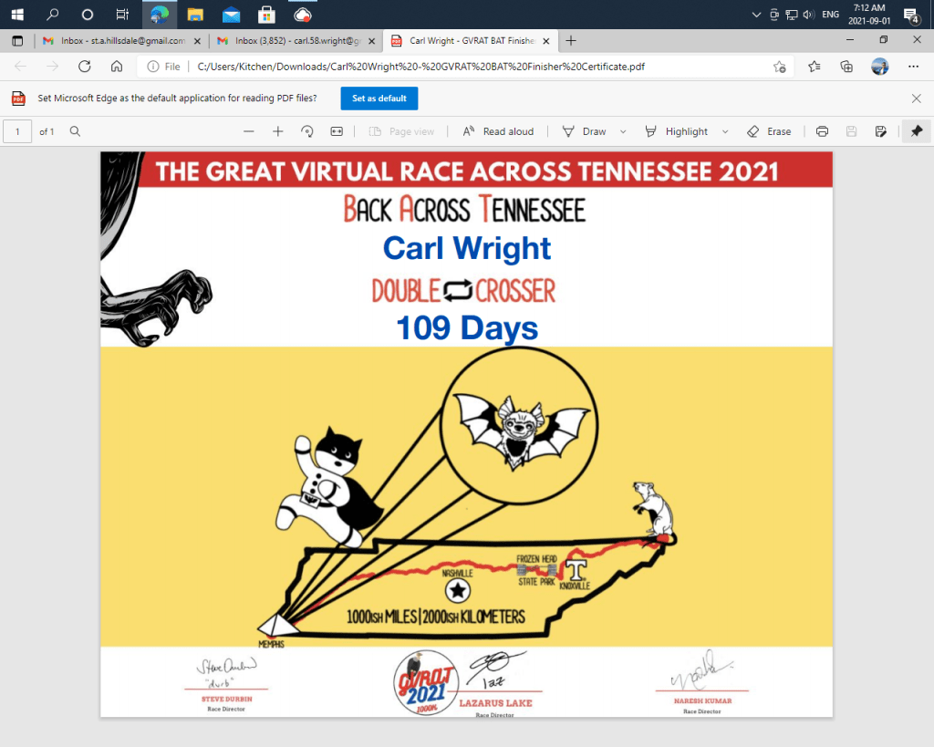 Overall the 2021 Great Virtual Run Across Tennessee has been very much Déjà Vu from the previous year. Except last year was a triple crossing and this year was a double crossing. It has been wonderful having this 4 month virtual run to keep me motivated. Part of this years’ double crossing was my 100k unsupported run. This year also involved a lot more litter picking, as I attempted to catch up from not doing it last year. Despite a lack of mushrooms to enjoy looking at and taking photos of this year during my 2000+ kilometer virtual journey, I have had some pretty awesome discoveries. Like watching a stick bug walk across a quiet gravel road. They are usually so camouflaged, I haven’t seen one in years. I’ve had 3 close up separate coyote sightings in just the past 3 weeks. Before I could get a photo, like a ghost they were gone. Never any threat to me, they were also a long way from any human settlement. Their beauty made my spine tingle. There had been travel restrictions earlier on this year with COVID, but even with them now lifted, I’ve had no desire to travel. Familiarity does develop contentment. It has been like a 17 month staycation. The most I’ve travelled from home last year was 35 kilometers. There wasn’t any increase on that this year. This is a beautiful area. I am very blessed. I’m so glad I’ve had so much time forest bathing, because this pandemic (and losing both my jobs) has been really hard on me mentally. Without it, this would have been even worse. Now that my dear wife and I are both double vaccinated, I was able to hug her for the 1st time in 16 months. Which is wonderful. She is postmaster of a post office where she is in contact daily with a lot of customers. Some customers who come in are very “anti-outspoken” in regards to masks and vaccinations.