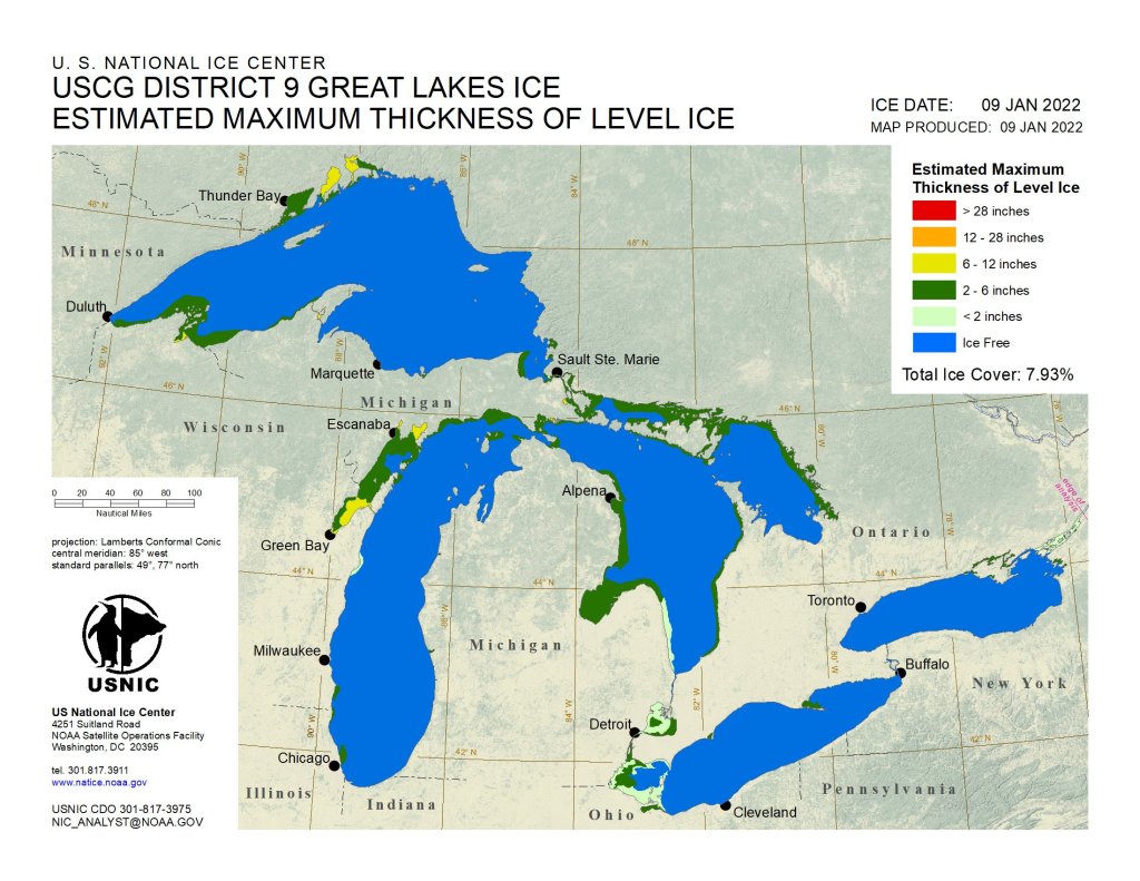 One week later on January 16th the ice coverage is at 16.4%. Keep that ice coming. The less ice there is, the greater lake evaporation takes place resulting in lower lake levels. Environmental Protection Agency mentions that “Rising water temperatures encourage the growth of certain waterborne bacteria that can make people ill”. Image Source