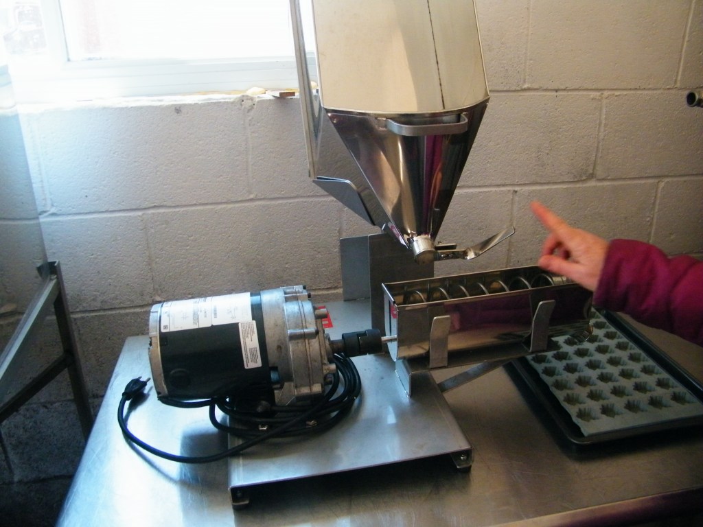 Other maple products you can buy are maple sugar, maple candy and maple butter. Maple sugar is made by heating the maple syrup further to the point where it turns it into crystallized sugar. Maple sugar is what our native ancestors used mostly. It could be stored for years. There are lots of recipes on the internet on how to make maple candy, which is like a fudge. There is a real art to making it. If you want to try making it at home, you will definitely need a candy thermometer. Then there is maple butter, where the name is a bit misleading. There is no butter or dairy product added, and made with 100% maple syrup. To produce maple butter, maple syrup is heated up, then quickly cooled down and whipped to a point where it becomes beautifully smooth like butter. In the early days it was a process called churning. Some pioneer farms used to have manual wooden butter churns for making dairy cream into butter. They also could have made maple butter with the butter churn. The state-of-art stainless steel machine that made maple butter at Williams Farm looked very impressive.