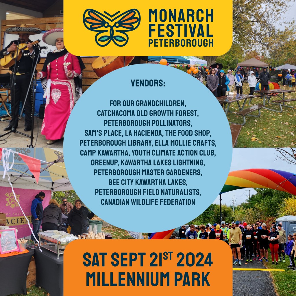 We are hosting a Monarch Race and Monarch Festival is to raise awareness for the iconic monarch butterfly on Sept. 21st in Peterborough. Is the monarch butterfly headed towards extinction? Here in Canada we are encouraged to plant milkweed, which is the only plant the monarch caterpillar feeds on. Along with the milkweed, people are planting native plant species that attract the monarch butterfly. With more and more people and municipalities doing this, at least the monarch will be in the best shape possible when they leave Canada in the fall migration.